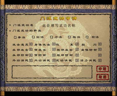 填写完单子后,点击“申请”按钮,由系统判断无误后即可获得门派武功。