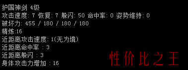综上所述,护国神剑确实不是最牛的武器,但是绝对是性价比最高的,只因为他便宜,容易弄到,属性适中,非常实用,如果你不是顶级高手,推荐你弄一把试试。